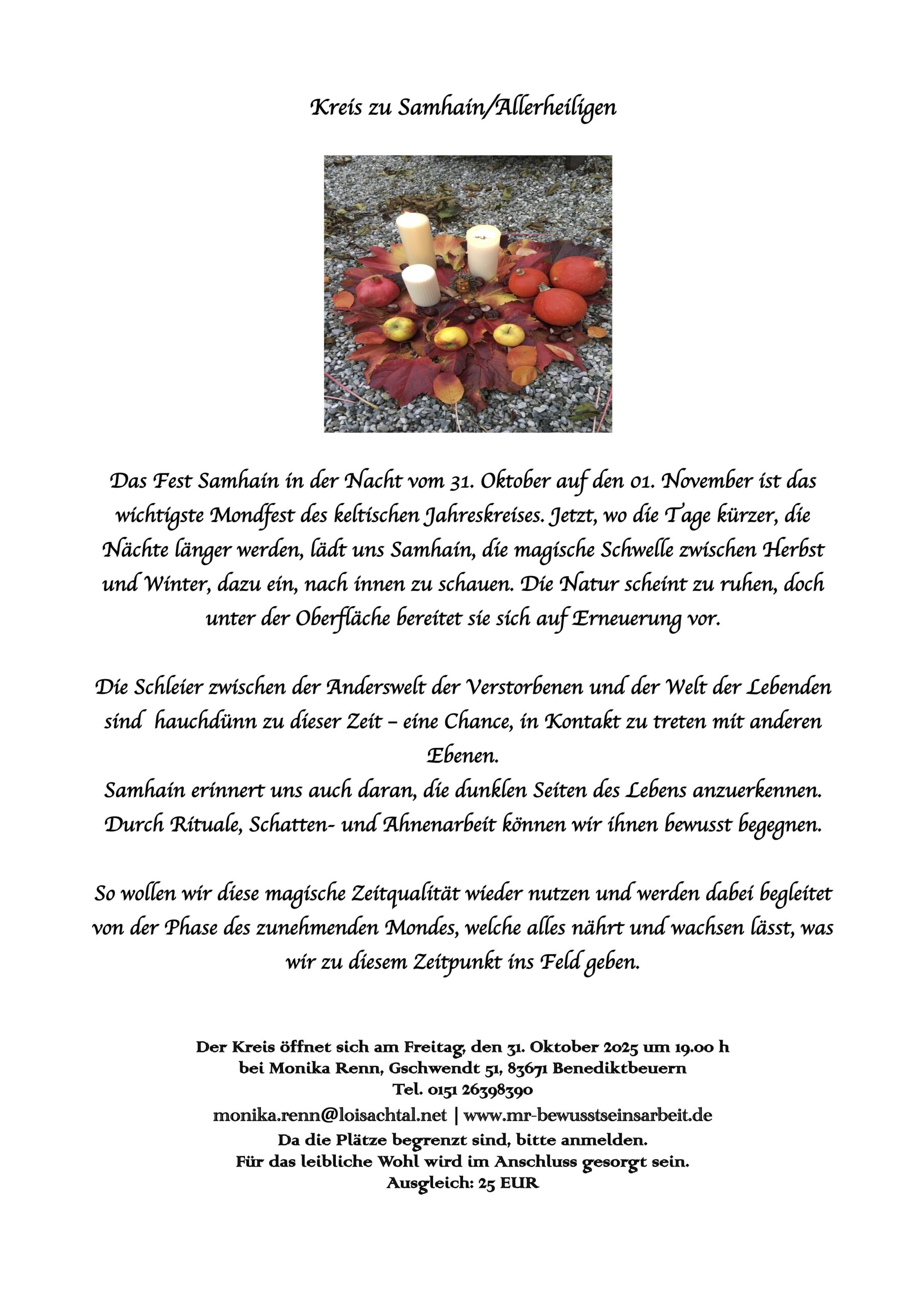 Zu diesem Zeitpunkt werden die Ahnen und Verstorbenen geehrt, denn sie befinden sich jetzt in regem Austausch mit unserer Welt. In dieser Nacht sind die Schleier zwischen der Lichtwelt und unserer Welt so durchlässig wie bei keinem anderen Jahreskreisfest. Es ist der Zeitpunkt, an dem das Göttliche das Licht über schwere Mächte scheinen und diese lichtvoll werden lässt – was im derzeitigen Weltgeschehen von elementarster Bedeutung ist. Die Aufgaben, die jedem einzelnen von uns in dieser Zeit des großen Wandels und Umbruchs zukommen, erfordern viel Kraft und Vertrauen in uns und unsere geistige Führung und in die alte Weisheit, die noch tief in uns schlummert. Und manchmal dürfen wir uns in dieser Zeit auch in Geduld und Hingabe an das Große Ganze üben. Einen liebevollen und unterstützenden Kontakt mit unseren Ahnen und Lieben auf der anderen Seit des Schleiers zu pflegen kann dabei sehr hilfreich sein.